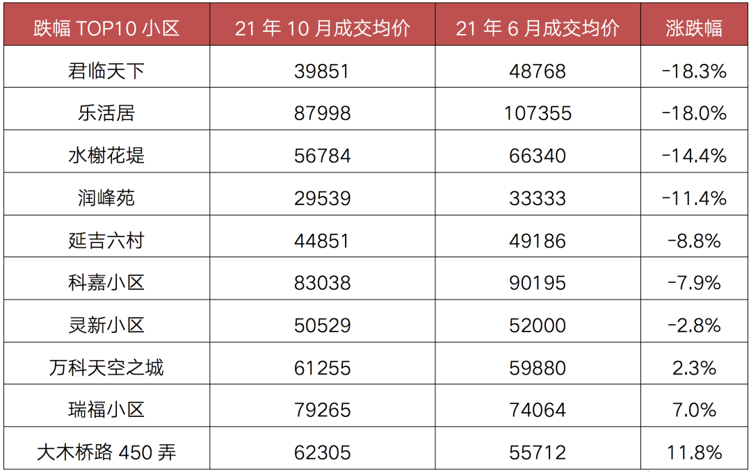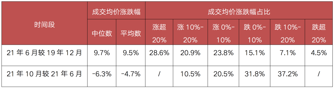 而在指導價出臺后,上海二手房價格則由漲轉跌。剔除零星成交的二手住宅小區,上海2021年10月二手住宅小區售價較2021年6月溫和下跌,可比價格跌幅中位數、平均數分別為-6.3%和-4.7%。其中,可比價格跌幅在10%-20%的二手房小區占比多達37.2%,其次為可比價格跌幅在0%-10%的二手房小區,占比約31.8%,另有31%的二手房小區可比價格仍有所上漲。