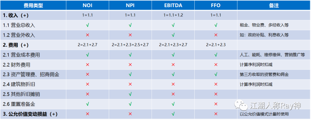 把兩項關于率的指標看完,我們再來看看關于金額的收益指標。NOI應該是當下大家聽的最多的了,那么為什么是NOI呢?凈營業(yè)收入(NOI)=總營業(yè)收入(EGI)-總營業(yè)費用(OPE),簡單來說也就是經營利潤,是經營性不動產由經營所帶來的收益。因為經營性不動產的價值是由收益程度決定,NOI自然也就成了度量不動產價值實現(xiàn)的金額指標。