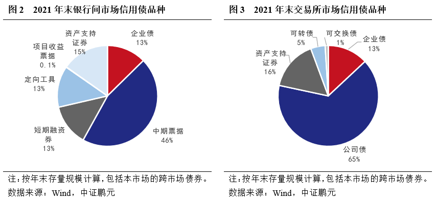 信用債規模上,銀行間市場相對交易所市場仍保持一定優勢,但兩市的規模差距逐步在縮小。2021年末銀行間市場信用債債券存量規模17.67萬億元、交易所市場信用債債券存量規模15.04萬億元,為銀行間的85%,該比例在2019年末為76%。由于銀行間市場(超)短期融資券以滾續發行為主,發行量較大,銀行間信用債發行規模遠超交易所市場。2021年銀行間信用債發行規模10.18萬億元、交易所信用債發行規模5.39億元,為銀行間的53%。此外,截至2021年末,交易所存量公司債發行主體數量3,192家,已超過銀行間市場存量信用債發行主體數量2,804家。