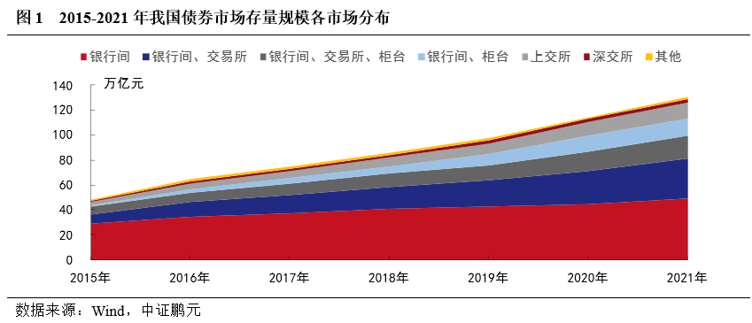 當前,我國債券市場以銀行間市場為主、交易所市場為輔的市場結構,隨著近年來交易所債券市場不斷擴容,其市場債券規模占比逐年攀升。銀行間債券市場上市券種主要包括國債、地方政府債、同業存單、金融債(以銀保機構債為主)、政府支持機構債、企業債、中期票據、短期融資券、定向工具、項目收益票據、ABN、銀保監會ABS;交易所債券市場上市券種主要包括國債、地方政府債、金融債(以證券公司債為主)、政府支持機構債、企業債、公司債、可轉債、可交換債、證監會主管ABS。其中,國債、地方政府債券、金融債、企業債等為跨市場交易債券品種。至2021年末,我國債券市場存量130.43萬億元,在銀行間債券市場(不含跨市場)上市的債券存量規模63.35萬億元,占總存量規模的49%,在交易所債券市場(不含跨市場)上市的債券存量規模15.46億元,占總存量規模的12%,在銀行間和交易所跨市場上市的債券存量規模約50億元,占總存量規模的38%,跨市場債券品種也大多由銀行間市場為主。近年來,隨交易所信用債市場擴容,交易所債券市場(不含跨市場)存量規模對總存量規模占比逐年攀升,由2015年的6%上升至2021年年末的12%。