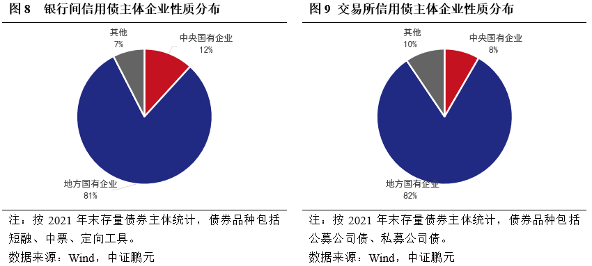 在企業性質上,交易所信用債的非國有性質的發行主體略多于銀行間市場,交易所市場相對更具有包容性。從2021年末存量債發行主體性質分布來看,銀行間信用債非國有發行主體占比7%,交易所信用債的該比例為10%。