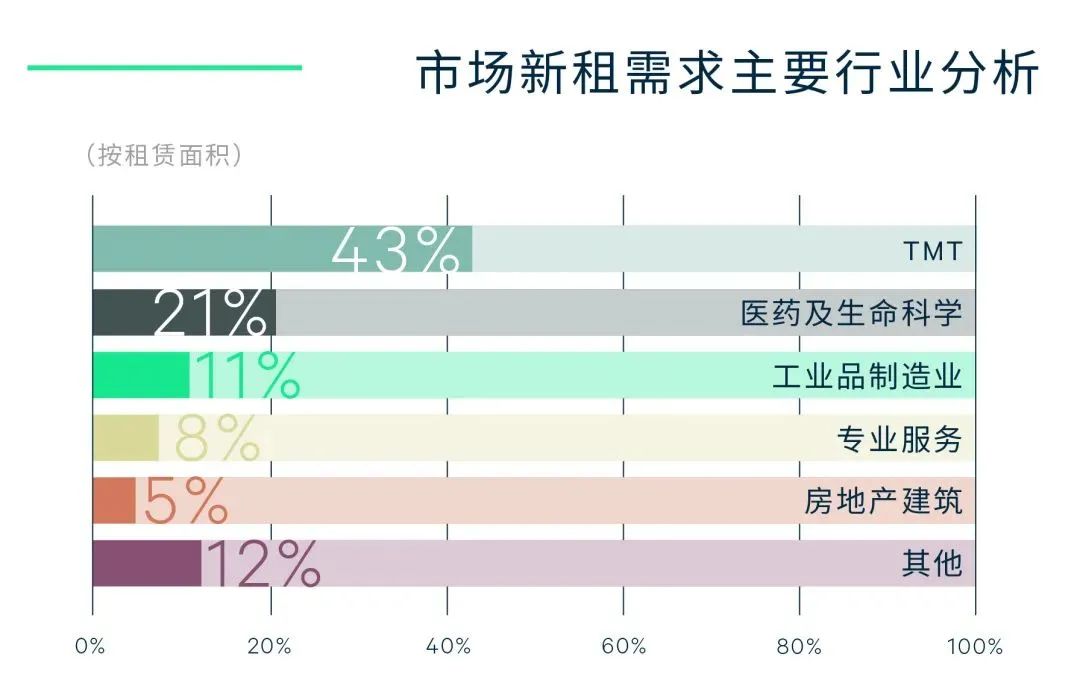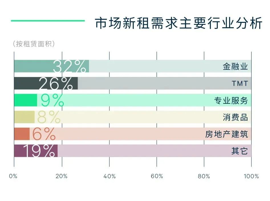 需求端看,一季度,金融重回新租需求行業(yè)榜首(占比32%),其中證券、基金以及金融科技擴租需求強勁。TMT的新租需求則集中在軟件開發(fā)、互聯(lián)網(wǎng)+消費服務(wù)及人工智能等領(lǐng)域。