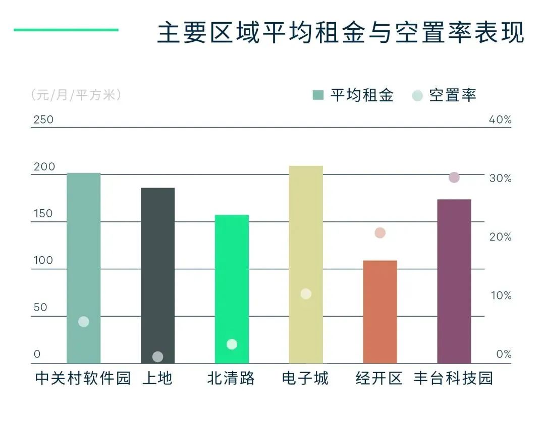中關(guān)村軟件園子市場受沖擊較大,錄得負的凈吸納量;而北清路子市場則憑借租金成本優(yōu)勢,空置率持續(xù)下行;上地、東升租賃活躍度保持平穩(wěn)。