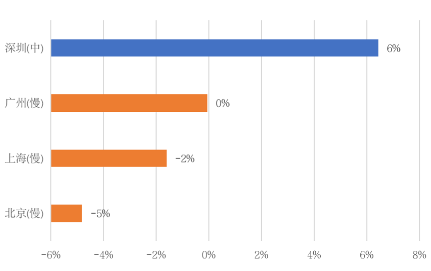 一線城市中,除深圳外,其余三市均為人才“緩增型”城市,即大學生數量占常住人口規模的比例增速均在60%以下。從四個城市近十年商品住宅成交規模復合增長率可以看出,大學生數量占比增幅最大的深圳近十年商品住宅成交規模復合增速達6%,顯著高于“緩增型”城市北上廣。
