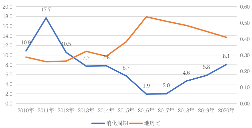 圖3.2 2010年以來武漢市商品住宅消化周期和年度成交地房比走勢(月)