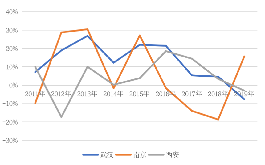 圖4.2 2011年~2019年武漢、南京和西安住宅成交面積同比走勢