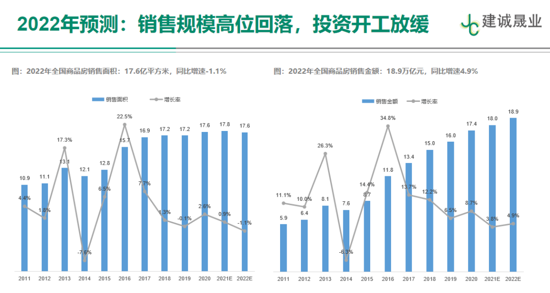 建誠晟業也測算,2022年樓市的特征是銷售規模高位回落、新開放緩、投資增速繼續下滑。