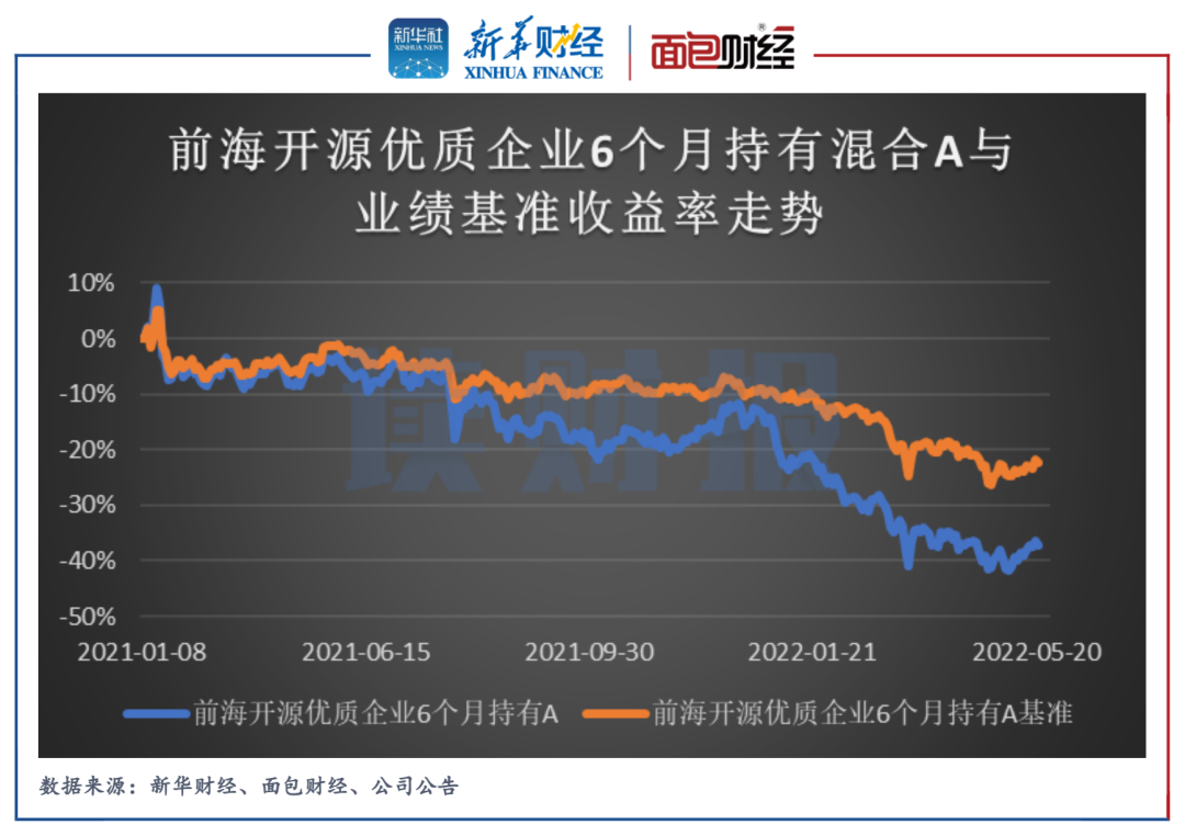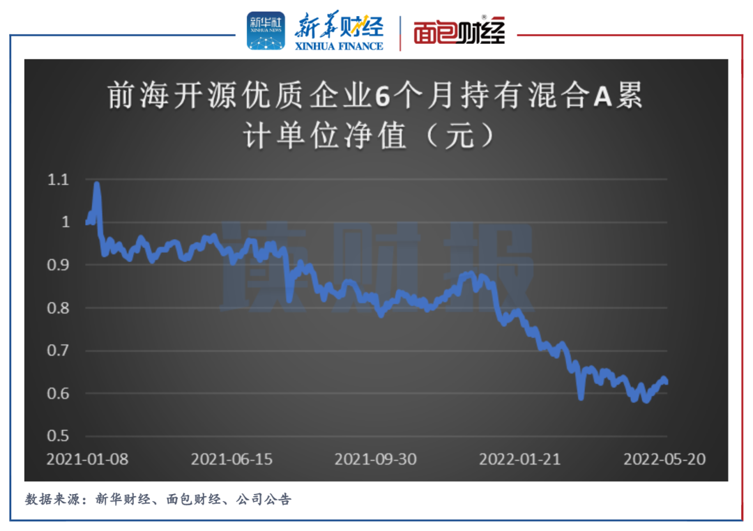 截至2022年5月23日,前海開源優質企業6個月持有混合A的單位凈值回升至0.6273元,年內回撤26.83%,在新華分類偏股型混基中排名2685/2896;成立以來最大回撤達到46.62%,累計跑輸基準近15個百分點。