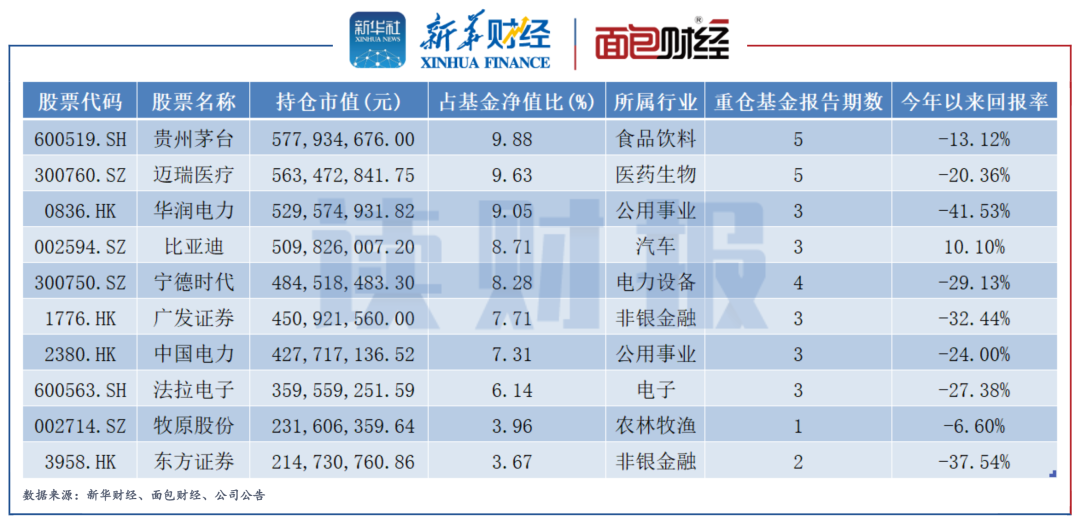 具體持倉來看,該基金重點配置了A股和港股中食品飲料、新能源、醫療、金融、電力運營等方向的頭部標的,其中貴州茅臺、邁瑞醫療兩只股票從成立以來一直持有,當前持倉比例均接近基金資產凈值的10%。
