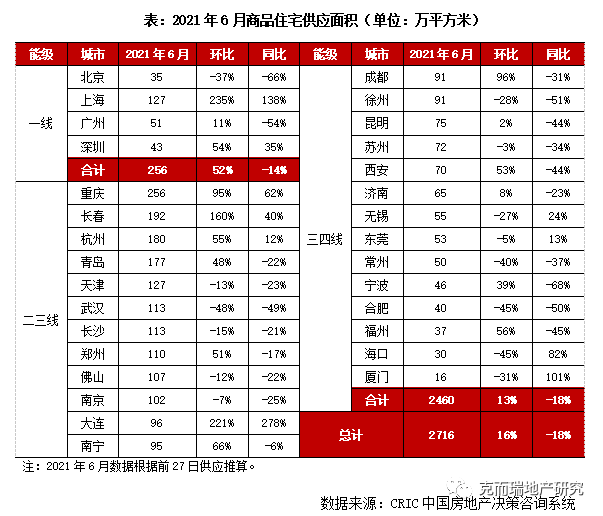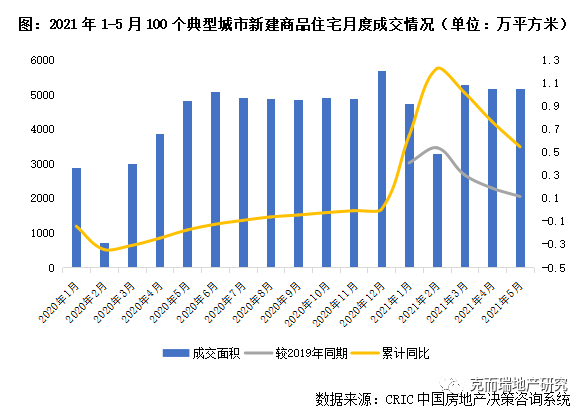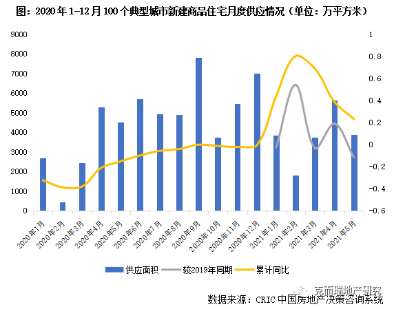 據(jù)CRIC統(tǒng)計,2021年1-5月全國100個重點城市商品住宅新增供應面積18930萬平方米,同比增長23%,相較2019年同期增長4%。