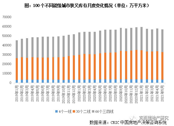 2021年開年以來,狹義庫存除2月顯著跳減之外,一直延續(xù)高位震蕩態(tài)勢。據(jù)CRIC監(jiān)測數(shù)據(jù),2021年5月百城商品住宅庫存量達到了56926萬平方米,環(huán)比微降1%,同比增長2%。“金三銀四”銷售旺季已過,5月房企推盤積極性略有回落,環(huán)比4月下降三成;成交熱度延續(xù),整體成交量與“銀四”基本持平:一線、三四線城市同環(huán)比齊降,需求釋放后略有回落;二線城市市場熱度穩(wěn)步回升,同環(huán)比齊增,顯著好于去年同期。總體來看,成交量略高于供應量,狹義庫存小幅微降。