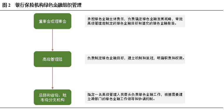 在銀行保險(xiǎn)機(jī)構(gòu)綠色金融業(yè)務(wù)的組織管理上,《指引》提到構(gòu)建自上而下的管理流程:董事會(huì)或理事會(huì)承擔(dān)綠色金融主體責(zé)任,負(fù)責(zé)確定綠色金融發(fā)展戰(zhàn)略,審批高級(jí)管理層制定的綠色金融目標(biāo)和提交的綠色金融報(bào)告;高級(jí)管理層應(yīng)當(dāng)根據(jù)董事會(huì)或理事會(huì)的決定,制定綠色金融目標(biāo),每年度向董事會(huì)或理事會(huì)報(bào)告綠色金融發(fā)展情況;總部和省級(jí)、地市級(jí)分支機(jī)構(gòu)應(yīng)當(dāng)指定一名高級(jí)管理人員牽頭負(fù)責(zé)綠色金融工作。