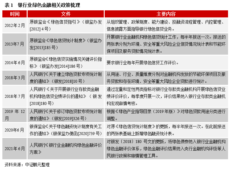 2012年原銀監(jiān)會(huì)發(fā)布《綠色信貸指引》指導(dǎo)銀行綠色信貸業(yè)務(wù)以來,原銀監(jiān)會(huì)、人民銀行相繼發(fā)布了綠色信貸統(tǒng)計(jì)相關(guān)制度和綠色信貸業(yè)績(jī)?cè)u(píng)價(jià)制度。2020年以來,隨著國(guó)內(nèi)綠色金融的繁榮發(fā)展,綠色金融取代綠色信貸,人民銀行、銀保監(jiān)會(huì)相繼更新了綠色融資統(tǒng)計(jì)制度和綠色金融評(píng)價(jià)方案。