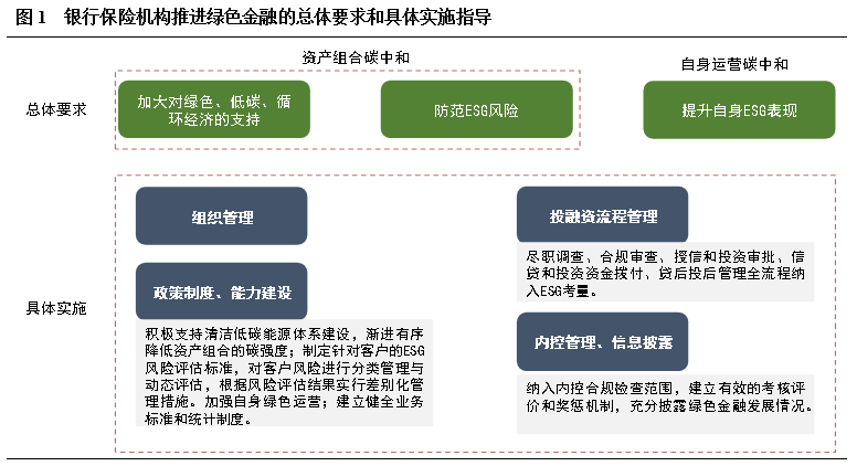 《指引》提出銀行保險(xiǎn)業(yè)推進(jìn)綠色金融工作的總體要求包括三個(gè)方面:加大對(duì)綠色、低碳、循環(huán)經(jīng)濟(jì)的支持;防范ESG風(fēng)險(xiǎn);提升自身ESG表現(xiàn)。最終推動(dòng)銀行保險(xiǎn)機(jī)構(gòu)實(shí)現(xiàn)“資產(chǎn)組合碳中和”和“自身運(yùn)營(yíng)碳中和”。具體實(shí)施上,《指引》從組織管理、政策制度、能力建設(shè)、投融資流程管理、內(nèi)控管理、信息披露方面全面指導(dǎo)銀行保險(xiǎn)機(jī)構(gòu)綠色金融業(yè)務(wù)。需要注意的是,《指引》是第一份保險(xiǎn)業(yè)綠色金融發(fā)展指導(dǎo)文件,且對(duì)保險(xiǎn)機(jī)構(gòu)資產(chǎn)端和負(fù)債端均提出了綠色發(fā)展要求,保險(xiǎn)機(jī)構(gòu)要積極開展綠色保險(xiǎn)和資金運(yùn)用,加大對(duì)綠色低碳發(fā)展的風(fēng)險(xiǎn)保障和資金支持。