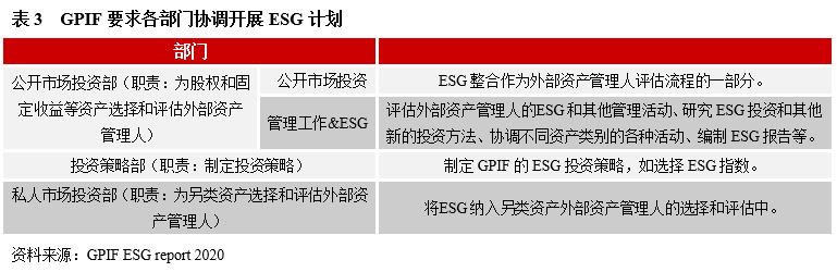 首先,在戰(zhàn)略層面,銀行保險(xiǎn)機(jī)構(gòu)可以將ESG納入公司發(fā)展戰(zhàn)略,并設(shè)立綠色金融發(fā)展業(yè)務(wù)目標(biāo),指導(dǎo)綠色金融業(yè)務(wù)的發(fā)展,還要向外界披露該戰(zhàn)略,以表達(dá)發(fā)展綠色金融的決心。在組織管理上,盡快設(shè)立專門的ESG委員會(huì),指定管理人員,統(tǒng)籌綠色金融工作管理、監(jiān)督等。在綠色金融業(yè)務(wù)開展過程中要注重各部門之間的協(xié)調(diào),明確各部門的職責(zé),以全球最大的公共養(yǎng)老金投資機(jī)構(gòu)——日本政府養(yǎng)老投資基金(GPIF)為例,GPIF要求公開市場(chǎng)投資部、投資策略部、私人市場(chǎng)投資部以及其他資產(chǎn)管理相關(guān)部門協(xié)調(diào)實(shí)施 ESG計(jì)劃。