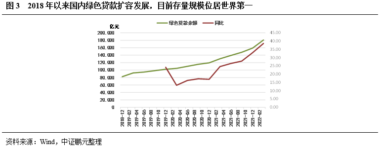 在這些政策的推動(dòng)下,國(guó)內(nèi)綠色貸款規(guī)模不斷擴(kuò)容發(fā)展。根據(jù)人民銀行相關(guān)數(shù)據(jù),2022年一季度末,綠色貸款余額18.07為萬億元,同比增長(zhǎng)38.6%,增速創(chuàng)新高。目前,國(guó)內(nèi)綠色貸款存量規(guī)模位居世界第一位。
