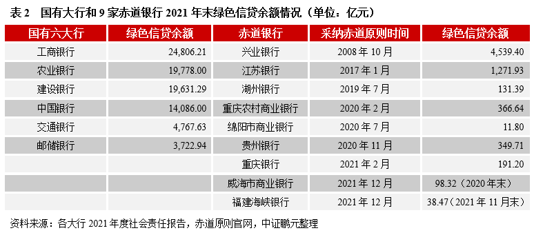 國(guó)有大行是國(guó)內(nèi)綠色金融實(shí)踐的“排頭兵”,在綠色金融組織管理、綠色貸款、綠色金融信息披露方面表現(xiàn)突出。此外,還通過自身發(fā)行綠色債券、承銷綠色債券、投資綠色債券等其他方式參與綠色金融。除了國(guó)有大行外,許多銀行在綠色金融方面的表現(xiàn)也可圈可點(diǎn)。一些銀行宣布采納赤道原則(赤道原則旨在判斷、評(píng)估和管理項(xiàng)目融資中環(huán)境和社會(huì)風(fēng)險(xiǎn),倡導(dǎo)金融機(jī)構(gòu)對(duì)項(xiàng)目融資中的環(huán)境和社會(huì)問題盡到審慎性核查義務(wù))成為赤道銀行,截止2022年5月末,國(guó)內(nèi)有9家赤道銀行。一些銀行創(chuàng)新綠色金融實(shí)踐,例如,多個(gè)銀行創(chuàng)建綠色特色支行,甚至已經(jīng)有部分銀行(如浦發(fā)銀行張江科技支行與閔行支行等)實(shí)現(xiàn)了自身運(yùn)營(yíng)的碳中和,被認(rèn)證為“碳中和”銀行