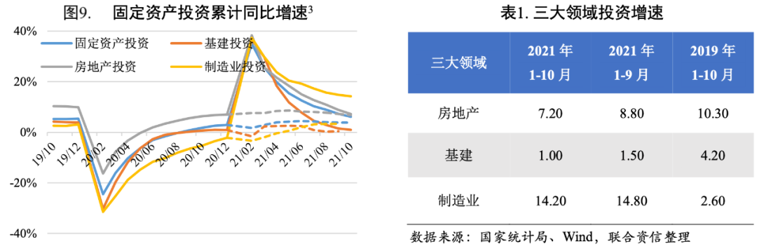 固定資產(chǎn)投資較疫情前仍有回升空間。2021年1-10月全國固定資產(chǎn)投資(不含農(nóng)戶)44.58萬億元,同比增長6.10%;兩年平均增長3.80%,持平1-9月,仍不及疫情前水平;環(huán)比增長0.15%,與上月持平。其中,制造業(yè)投資對固定資產(chǎn)投資的支撐作用進一步上升,房地產(chǎn)和基建投資增速繼續(xù)下行,對固定資產(chǎn)投資的拉動作用進一步下降。