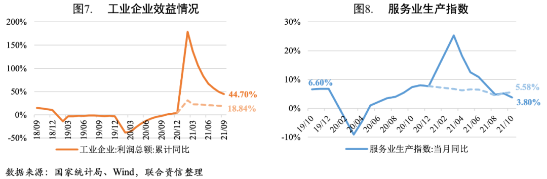 2021年10月,我國多項經(jīng)濟指標出現(xiàn)改善跡象。生產(chǎn)端,10月工業(yè)增加值同比增速和兩年平均增速[1]結(jié)束下行趨勢,企穩(wěn)反彈,主要是受到能源保供政策發(fā)力拉動。需求端,固定資產(chǎn)投資增速繼續(xù)放緩,主要是受房地產(chǎn)和基建投資增速放緩拖累,制造業(yè)投資在出口帶動下維持高增長;消費在假日和價格雙重因素的影響下,延續(xù)小幅改善趨勢,預計11月電商促銷活動疊加失業(yè)率下降帶來的居民可支配收入的增加將繼續(xù)提振消費,但十月下旬以來多地疫情散發(fā)將拖累消費修復;出口在外需、出口替代以及價格的支撐下,保持較強的韌性,年內(nèi)出口增速有望保持在較高的水平。整體看,雖然10月多項經(jīng)濟指標均出現(xiàn)改善的信號,但疫情對消費產(chǎn)生擾動,房地產(chǎn)投資仍將維持下行趨勢,環(huán)保和高能耗行業(yè)限產(chǎn)以及冬季極端氣候現(xiàn)象或?qū)I(yè)生產(chǎn)產(chǎn)生拖累,年內(nèi)經(jīng)濟仍存在下行壓力。