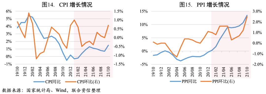 受國際輸入性因素疊加國內(nèi)主要能源和原材料供應(yīng)偏緊影響,10月PPI漲幅再次擴大。10月PPI同比增幅較9月擴大2.80個百分點至13.50%,創(chuàng)歷史最高值。其中,生產(chǎn)資料價格上漲17.90%,漲幅擴大3.70個百分點,主要是受國際價格上漲疊加國內(nèi)主要能源和原材料供應(yīng)偏緊影響;生活資料價格上漲0.60%,漲幅擴大0.20個百分點。從環(huán)比看,PPI漲幅較9月擴大1.30個百分點至2.50%。近期煤炭、鋼材等價格下行,疊加國內(nèi)大宗商品價格控制政策、北方建筑工業(yè)停工導致黑色金屬需求減弱,或?qū)?1月PPI下行,PPI-CPI剪刀差收窄,中下游企業(yè)盈利情況或?qū)⒑棉D(zhuǎn)。