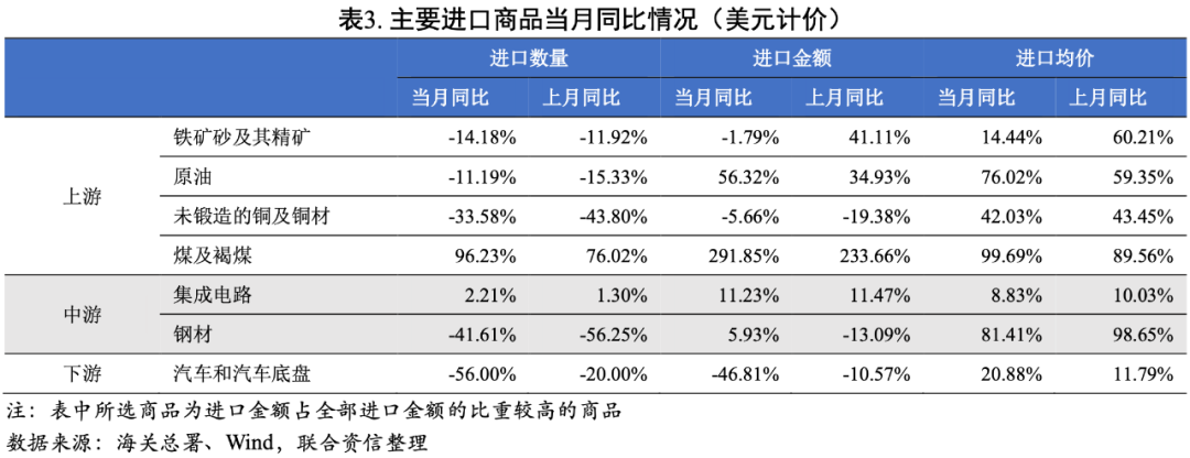 進口方面,從主要進口商品來看,煤炭因為冬季供暖需求量較大,進口數(shù)量大幅上升;集成電路由于全球供應(yīng)鏈短缺導致進口數(shù)量增速維持低位;價格上漲疊加國內(nèi)需求減弱導致鐵礦砂、原油、銅、鋼材以及汽車的進口數(shù)量均同比減少。年內(nèi)能耗雙控壓力仍然較大,國內(nèi)工業(yè)生產(chǎn)承壓,導致對海外原料的需求下降,同時疊加疫情反復對消費的制約,預計進口數(shù)量或?qū)⒗^續(xù)下降。