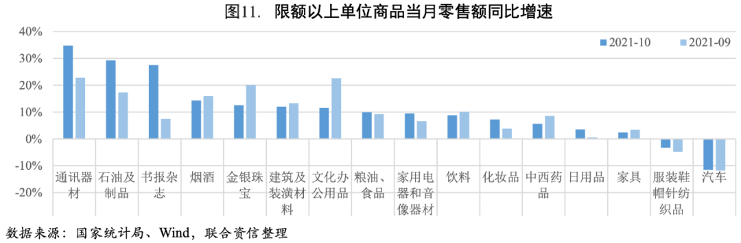 商品零售小幅增加,餐飲收入增速小幅回落。10月商品零售同比增速較上月上升0.7個百分點至5.20%,增速仍低于疫情前水平。汽車消費繼續(xù)負增長,是拖累商品零售的一大因素;通訊器材、石油及制品和書報雜志增速均在25%以上,且較上月顯著增長;服裝鞋帽針紡織品零售額增速降幅雖有收窄但依然為負。餐飲收入增速小幅回落,餐飲收入增速較9月下降1.1個百分點至2.00%,預計11月受疫情影響,餐飲收入增速會有所下降。