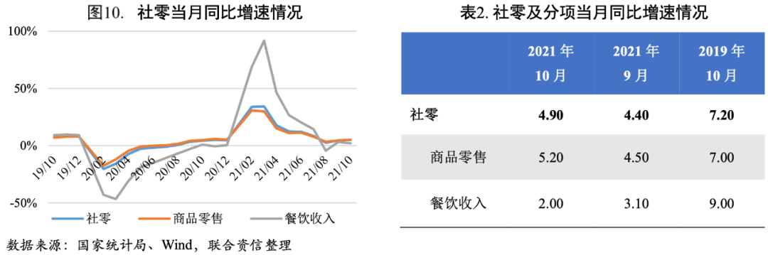 國慶假期效應(yīng)提振消費,但疫情和天氣因素制約修復進程。2021年10月社會消費品零售總額(下稱“社零”)增長4.90%,連續(xù)第二個月回升;環(huán)比增長0.43%,較上月小幅提升。社零同比和環(huán)比增速小幅回升主要是受益于國慶假期消費帶動,同時價格因素也是推升社零增速的原因之一。但天氣以及疫情制約社零的修復,社零同比和環(huán)比增速較疫情前水平尚有修復空間。預計11月電商促銷活動疊加失業(yè)率下降帶來的居民可支配收入的增加將繼續(xù)提振消費,但十月下旬以來多地疫情散發(fā)將拖累消費修復。
