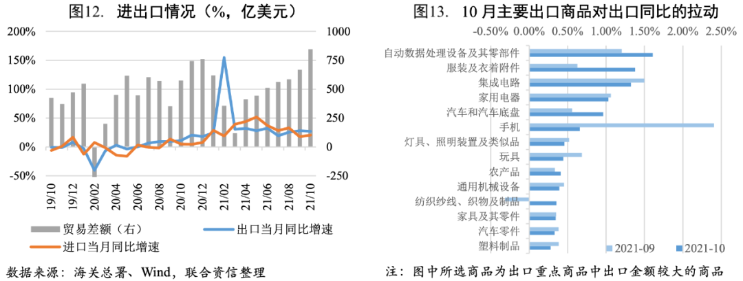 2021年10月我國貨物進出口總額5159.03億美元,同比增長24.30%,增速仍然較高;但環(huán)比(-5.30%)有所下降。其中,出口3002.21億美元,同比增長27.10%,仍然維持較高增速,環(huán)比小幅下降1.80%,依然表現(xiàn)出較強的韌性,一方面是由于歐美作為主要需求國,產(chǎn)需缺口依然較大,另一方面出口替代效應(yīng)導致我國出口增加。進口2156.80億美元,同比增長20.60%,主要是價格上漲和去年基數(shù)(較低)因素導致;環(huán)比下降9.70%,符合往年下行規(guī)律。整體看,內(nèi)需對進口的支撐作用較弱。貿(mào)易順差845.40億美元,創(chuàng)歷史最高值。2021年前10個月貿(mào)易順差累計5106.35億美元,已接近去年全年水平,今年順差規(guī)模或?qū)?chuàng)歷史最高,對經(jīng)濟的拉動作用或?qū)⒂兴嵘?/p>