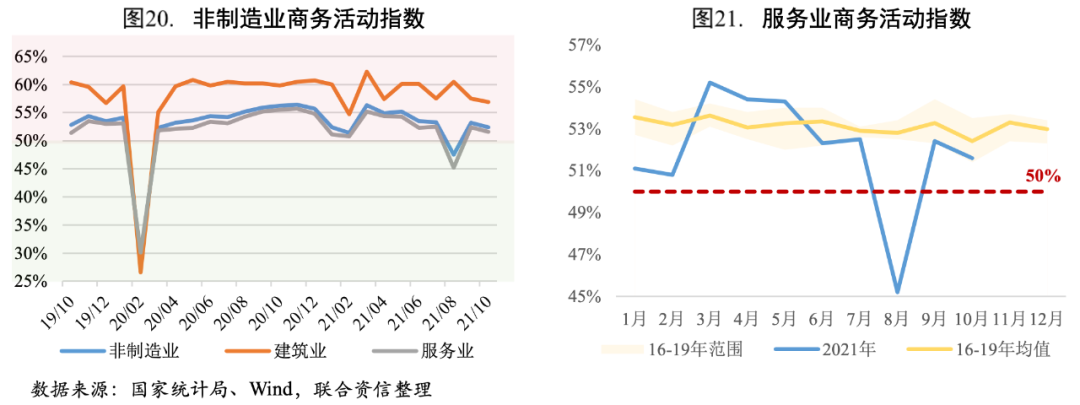 2021年10月,非制造業(yè)商務(wù)活動指數(shù)較上月回落0.80個百分點至52.40%,非制造業(yè)繼續(xù)保持擴張,但擴張幅度減小。其中服務(wù)業(yè)景氣度小幅回落,商務(wù)活動指數(shù)下降0.80個百分點至51.60%,主要是多點散發(fā)式疫情給尚處于恢復過程中的服務(wù)業(yè)帶來較大沖擊。從行業(yè)情況來看,受國慶節(jié)拉動,與假期消費密切相關(guān)的住宿、餐飲、生態(tài)保護及環(huán)境治理、娛樂等行業(yè)商務(wù)活動指數(shù)均位于55%以上較高景氣區(qū)間。但受疫情和天氣等影響,消費者更傾向于就地過節(jié)或短途周邊游,10月鐵路運輸、航空運輸?shù)刃袠I(yè)商務(wù)活動指數(shù)雖位于榮枯線以上,但擴張力度相對較弱,景氣水平不及近年同期。建筑業(yè)景氣度同步小幅回落,商務(wù)活動指數(shù)下降0.60個百分點至56.90%,但仍位于較高景氣區(qū)間,建筑業(yè)生產(chǎn)持續(xù)增長。