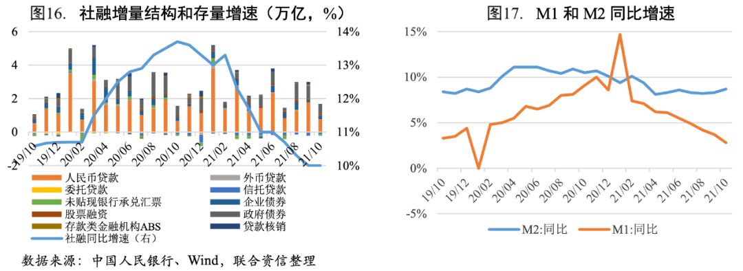 社融存量同比增速與上月持平,人民幣貸款和政府債券融資是主要支撐。2021年10月新增社融1.59萬億元,同比多增1971億元,三個月以來首次轉(zhuǎn)正;社融存量增速為10%,與9月持平。從社融結(jié)構(gòu)來看,10月新增人民幣貸款和政府債券融資同比分別多增1089億元、1236億元,是社融的主要支撐項;新增委托、信托貸款和未貼現(xiàn)銀行承兌匯票共-2120億元,非標融資規(guī)模持續(xù)萎縮;其他分項同比變化不大。在政府債發(fā)行與上年錯期的影響下,疊加房企融資政策邊際松動,以及9月底央行宣布年內(nèi)新增的3000億小微再貸款額度逐步落地,對企業(yè)貸款也會形成一定支撐,預計11、12月社融增速將會有所回升。