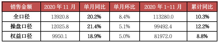 2020年11月,TOP100房企實(shí)現(xiàn)銷售操盤金額12025.8億元,單月業(yè)績同比增長21.4%,環(huán)比較上月小幅上升5.1%。實(shí)現(xiàn)全口徑金額13920.8億元,同比增長20.2%,環(huán)比增長8.4%,累計(jì)來看,前11月TOP100房企實(shí)現(xiàn)銷售操盤金額99492.4億元,實(shí)現(xiàn)全口徑金額113280.0億元,累計(jì)同比分別為12.2%與10.3%。