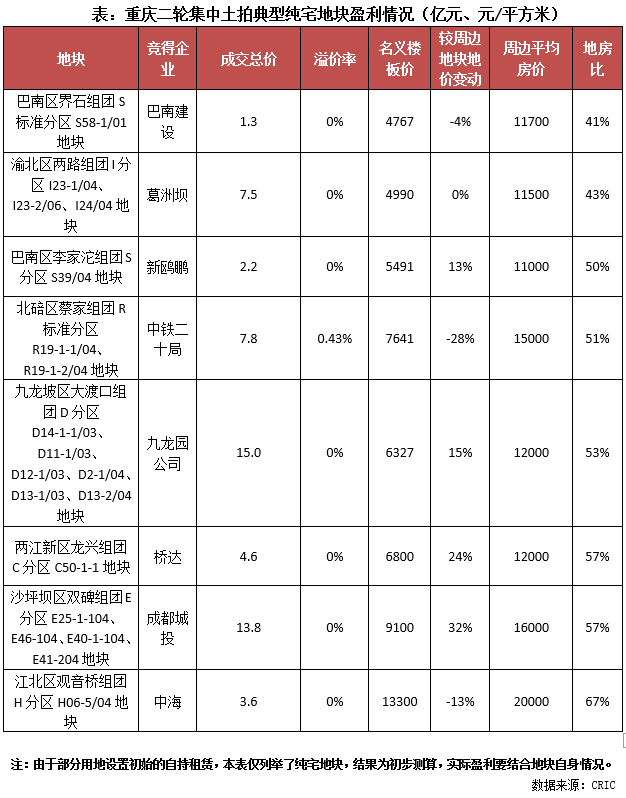 而就盈利情況來(lái)看,平均地房比為0.52(不考慮含自持租賃的地塊,下同),較首輪明顯提升,尤其是巴南、渝北的一些地塊,地房比低至0.4,典型如巴南區(qū)界石組團(tuán)S標(biāo)準(zhǔn)分區(qū)S58-1/01地塊,樓面價(jià)僅有4767元/平方米,這一價(jià)格較萬(wàn)科在周邊拿下的同類地塊樓板價(jià)要低4%(該地在首輪集中出讓,樓板價(jià)4975元/平方米),按照周邊在售項(xiàng)目平均銷售價(jià)11700元/平方米來(lái)測(cè)算,地房比低至0.41,房地差近7000元/平方米,盈利空間十分可觀。即使是本場(chǎng)土拍中唯一溢價(jià)成交的北碚區(qū)蔡家地塊(樓板價(jià)7641元/平方米),按照周邊在售均價(jià)15000元/平方米來(lái)測(cè)算的話,地房比也僅有51%,也能保持良好的盈利。