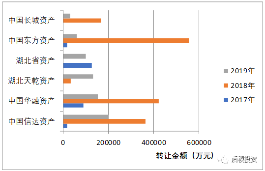 從上圖所知,各家持牌AMC間轉讓金額“貧富差距”并不像18年那么大,平緩消耗自家庫存量。