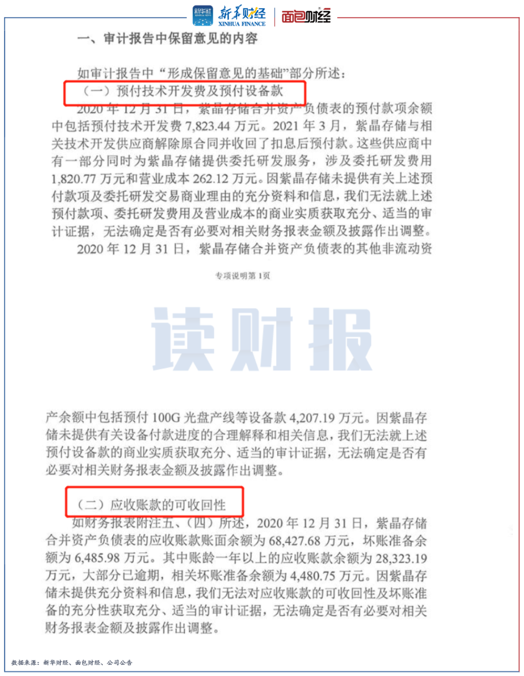 目前,根據紫晶存儲披露的立案告知書,未具體說明哪些信披涉嫌“違法違規”。紫晶存儲于2020年2月上市,而立信會計師事務所對該公司2020年的財務報表遂出具了保留意見審計報告,主要涉及“預付技術開發費及預付設備款”和“應收賬款的可收回性”。