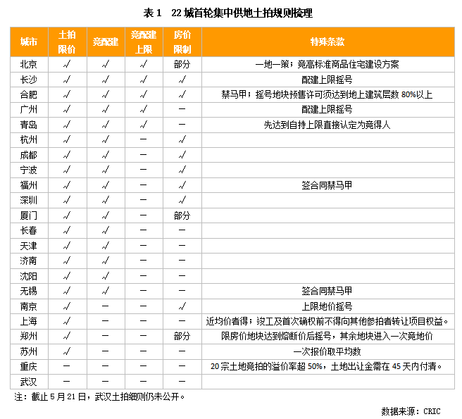 盡管大部分城市都采取了雙重限價等措施,但結(jié)合已完成首輪土拍城市表現(xiàn)來看,仍有不少城市出現(xiàn)了競拍高熱現(xiàn)象。因此,在“三穩(wěn)”要求進一步落實的背景下,重慶、杭州、無錫等首輪土拍高熱城市極有可能會在二三批次供地時對出讓規(guī)則進行升級,以穩(wěn)定市場預期。