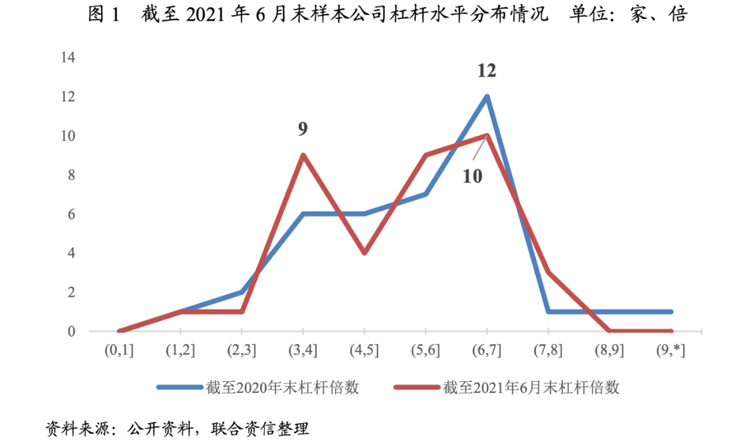 杠桿倍數不超過8倍。以2020年末數據為基礎,樣本公司[2]中杠桿倍數[3]超過8倍的有2家,并且這2家樣本公司2021年以來杠桿倍數均出現下降。截至2021年6月末,樣本公司的杠桿倍數均小于8倍。從下圖來看,截至2021年6月末,樣本公司杠桿倍數主要分布在3~4倍和在6~7倍。同時,2021年以來,樣本公司杠桿倍數整體偏移到較小區間,大部分樣本公司杠桿水平控制在合理范圍之內。