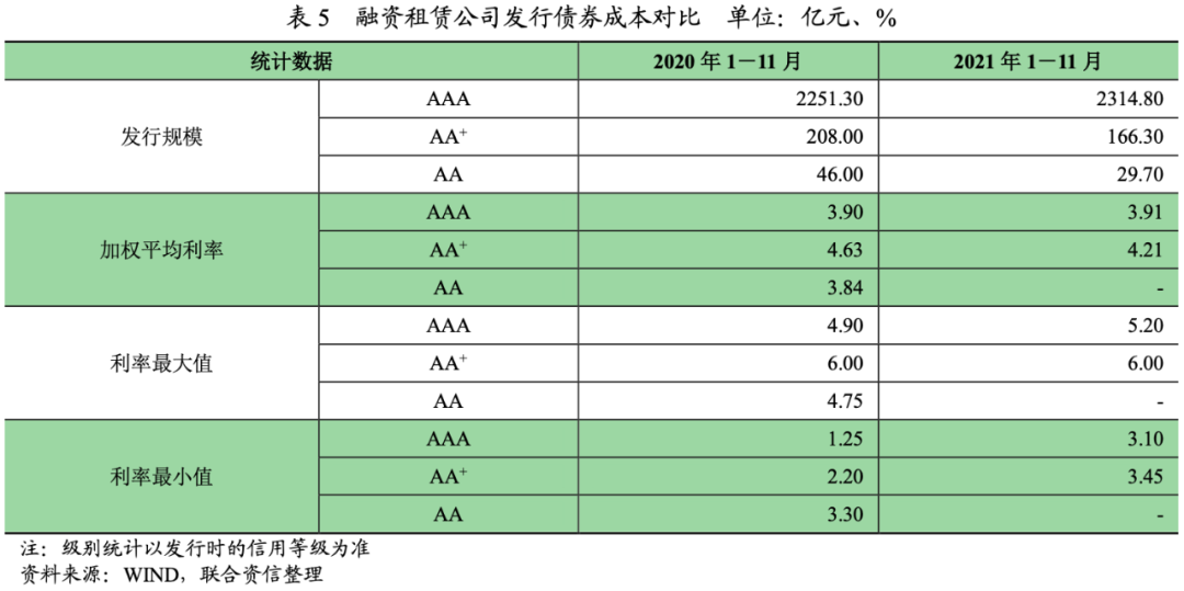 2021年,AA+級別融資租賃公司發行債券和資產證券化產品成本均較上年同期下降,與AAA級別利差較上年同期有所收縮;融資租賃公司股東背景和股東支持的認可度對其債券發行成本有較大的影響,融資租賃公司融資端分化情況仍然存在。