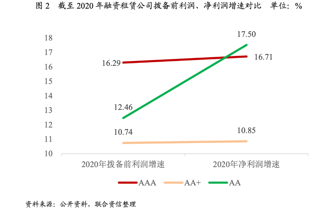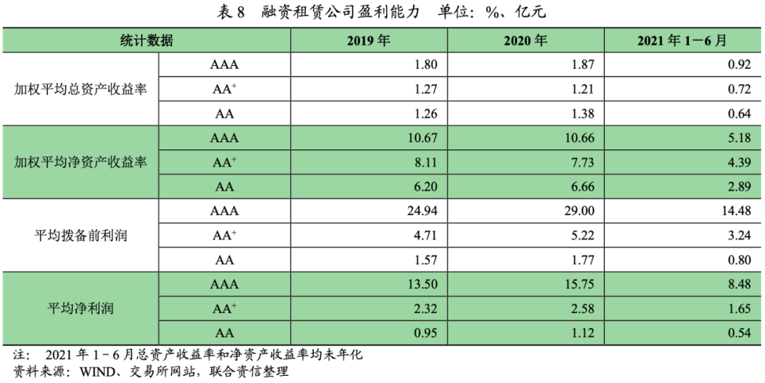 2020年,樣本融資租賃公司盈利規模有所增長,AAA級別融資租賃公司平均撥備前利潤增速最快,但是,AA級別融資租賃公司的平均凈利潤增長最快。2021年上半年,各級別樣本公司融資租賃公司凈利潤均實現增長,但是分化明顯。