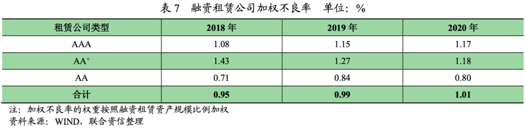 整體看,受近年來宏觀經濟下行,信用風險事件頻發影響,融資租賃公司不良率總體呈上升趨勢,資產質量承壓,但部分風控能力較強或主要開展產業集團內業務的融資租賃公司資產質量仍能得到保障,不良率分化趨勢較顯著。在有披露2021年6月末不良率的17家樣本公司中,有5家樣本公司的2021年6月末的不良率較2020年末有所提高。