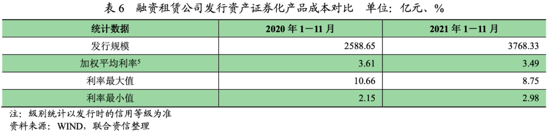 根據WIND統計,2021年1-11月,融資租賃公司發行資產證券化產品合計3768.33億元,較上年同期(2588.65億元)上升45.57%。