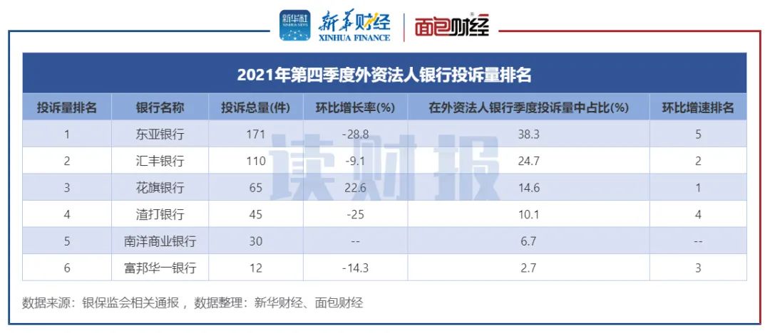 外資法人銀行中,2021年第四季度東亞銀行消費者投訴總量位居榜首,花旗銀行投訴增速最快。