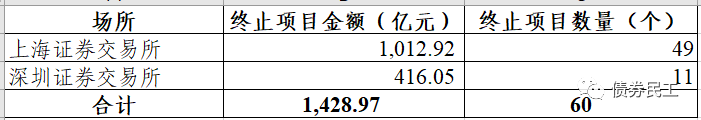 根據上海證券交易所和深圳證券交易所公司債券項目信息平臺的公開信息,2022年3月終止的債券項目(小公募、私募債和ABS)金額合計為1,428.97億元,終止項目數量60個。其中上海證券交易所終止金額為1,012.92億元,占比為70.88%;深圳證券交易所終止金額為416.05億元,占比為29.12%。1575.40億元,