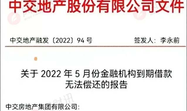 近日一份紅頭的“中交地產股份有限公司文件”廣為流傳,文件題為“關于2022年5月份金融機構到期借款無法償還的報告”,署名簽發人為公司董事長李永前,文件號“中交地產融發[2022]94號”。