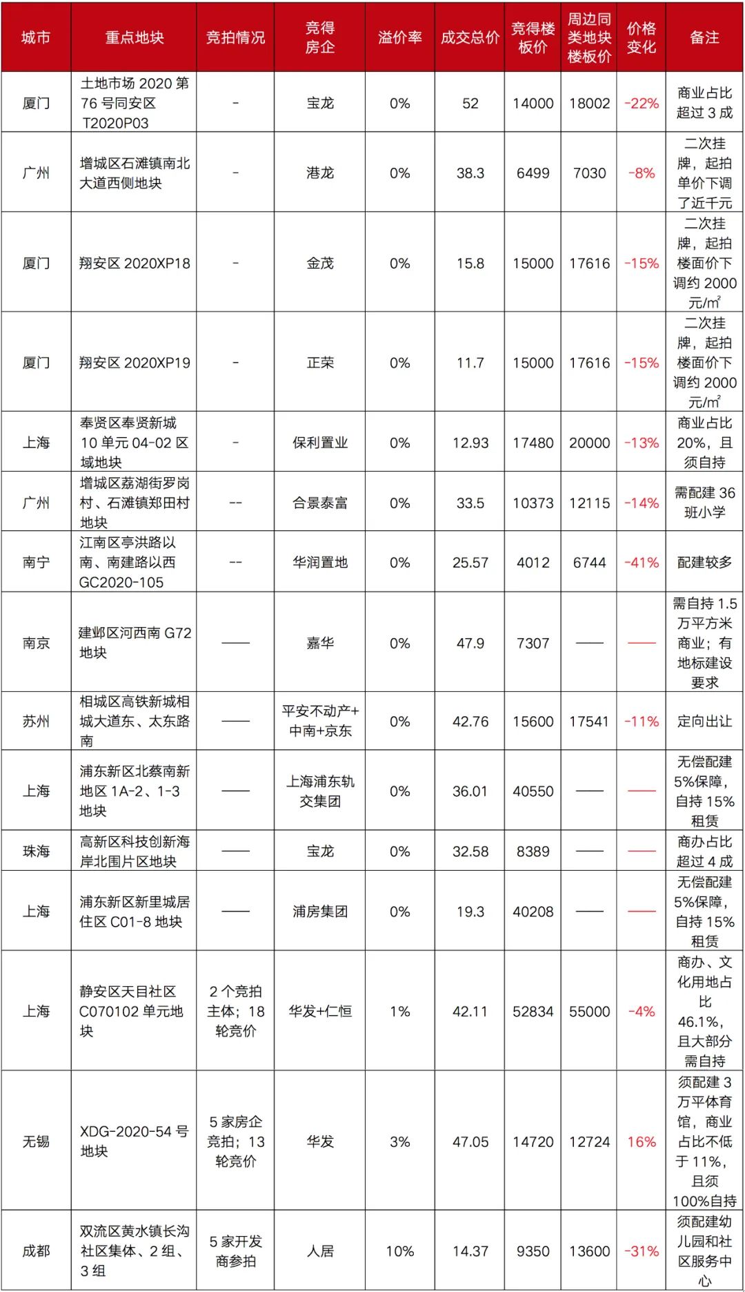 從近一個月重點地塊低溢價成交情況來看,廈門、南寧、成都等地的成交價格較同板塊內最近成交的同類地塊相比出現了大幅下跌。