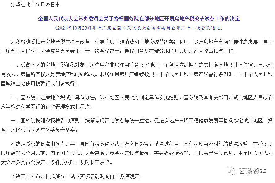 2021年10月23日,第十三屆全國人大常委會第三十一次會議作出決定,授權(quán)國務院在部分地區(qū)開展房地產(chǎn)稅改革試點工作。