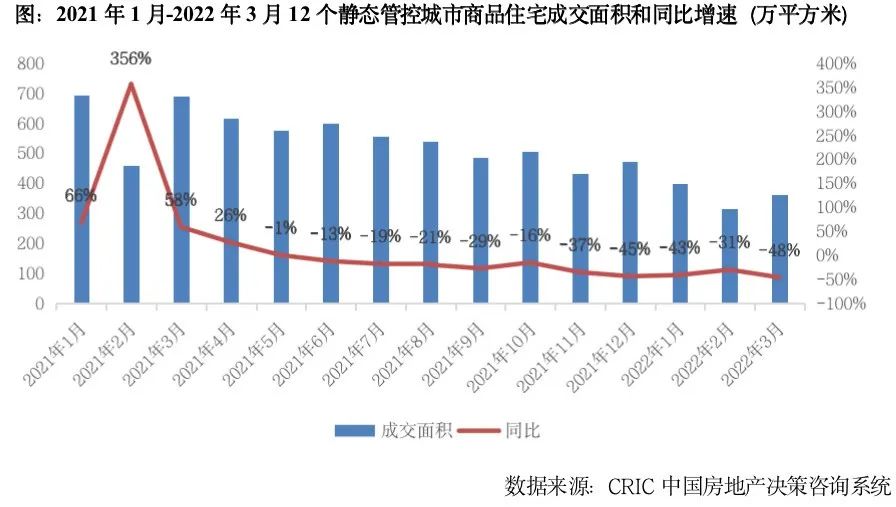 靜態管控城市樓市近乎停擺,成交加速下滑。3月,12個靜態管控城市商品住宅成交面積362萬平方米,同比下跌48%,跌幅較2月擴大17個百分點。