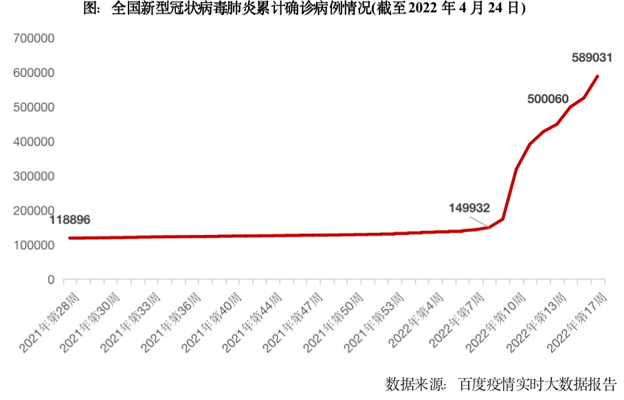 2月下旬以來,全國新冠確診病例數呈快速攀升走勢,累計確診病例數突破50萬。截至4月24日,全國(含港澳臺)報告累計新型冠狀病毒肺炎確診病例58.9萬例,較一周前增加6.3萬例,較2022年初增加45萬例,累計死亡病例14881例,較年初增加近1萬例。