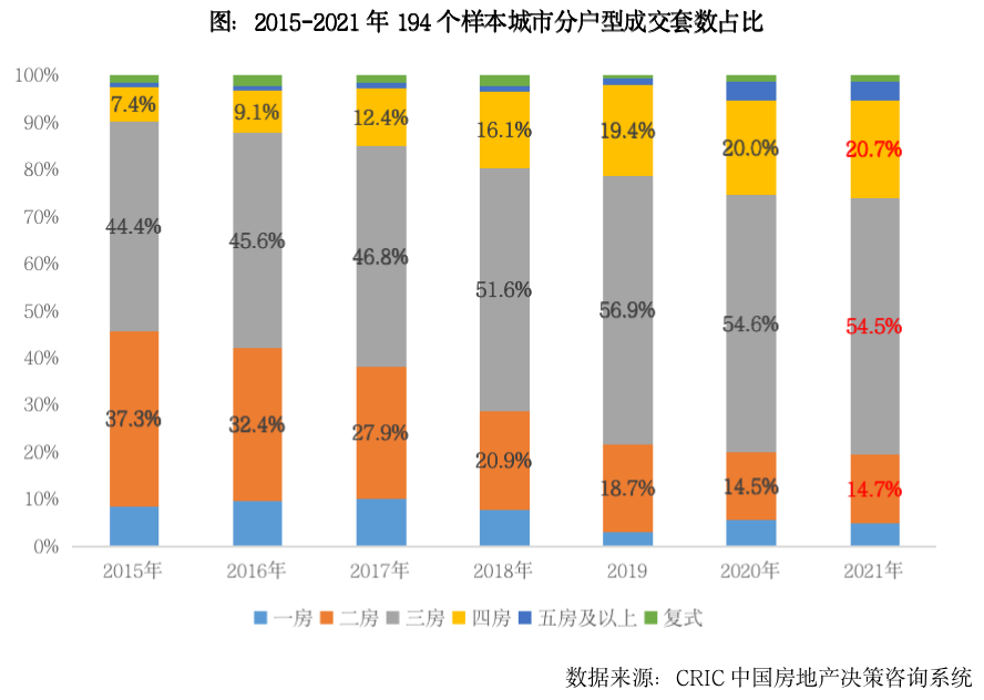 受限貸政策影響,大量改善性需求被壓制。2021年,改善性需求相對堅挺,據CRIC重點監測的 194個樣本城市成交結構數據顯示,三房成交套數占比高達54.5%,四房成交占比穩步提升至20.7%。但受限貸政策影響,不少城市二套房首付比例都在50%以上,部分城市更是達到70%乃至80%,很大程度上提升了改善性客群首付款支出壓力,大量改善性需求被壓制。