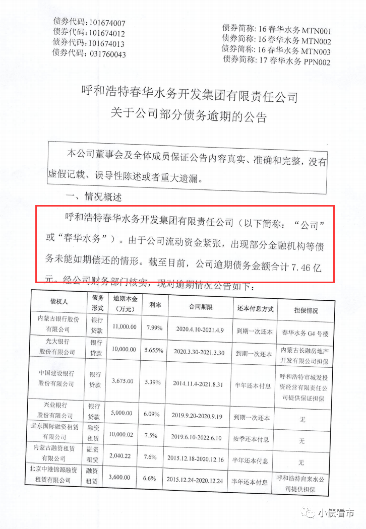 4月30日,呼和浩特春華水務開發集團有限責任公司(以下簡稱“春華水務”)公告稱,由于公司流動資金緊張,出現部分金融機構等債務未能如期償還的情形。