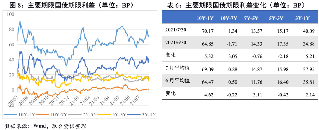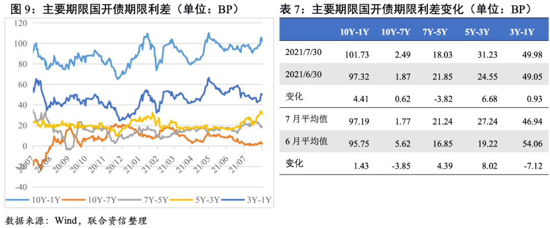 期限利差大多走闊。從期限利差均值來看,國債10Y-7Y和5Y-3Y期限利差均有所收窄,其余主要期限利差均有所走闊,表明短端利率受資金面影響下行更為顯著。國開債主要期限利差中,10Y-7Y和3Y-1Y期限利差收窄,其余期限利差走闊。截至7月末,國債7Y-5Y和5Y-3Y期限利差有所收窄,國開債7Y-5Y期限利差收窄。整體看,7月主要期限國債和國開債期限利差較6月均有所擴大,收益曲線較6月陡峭化。